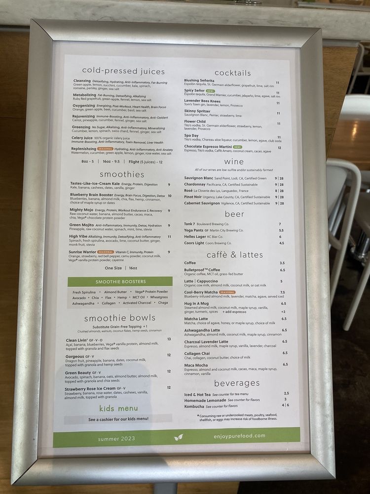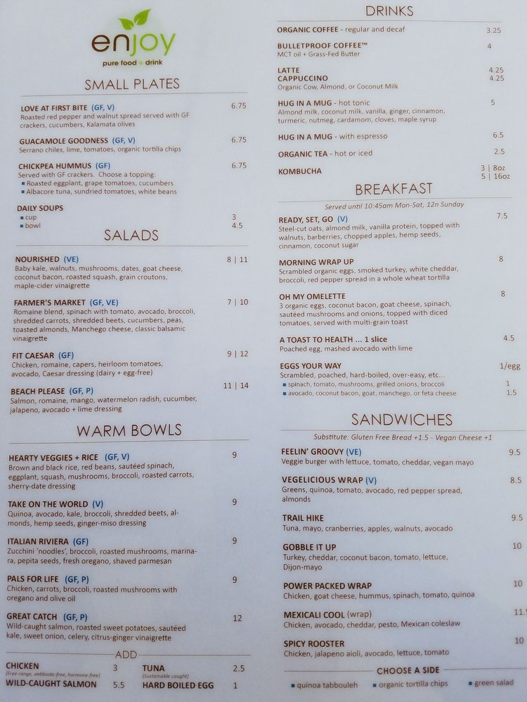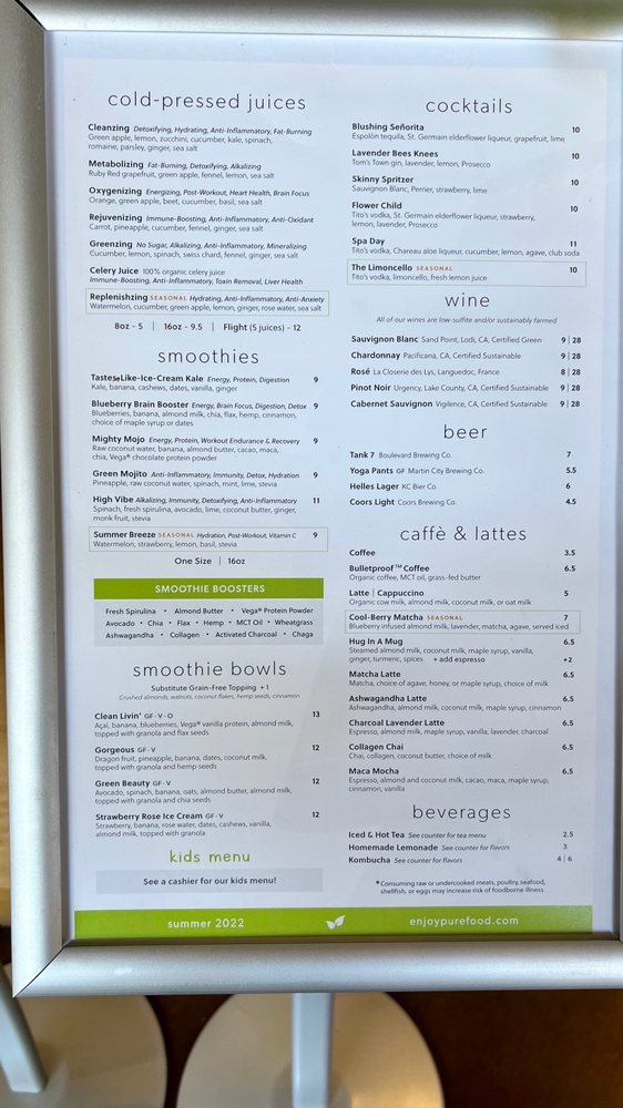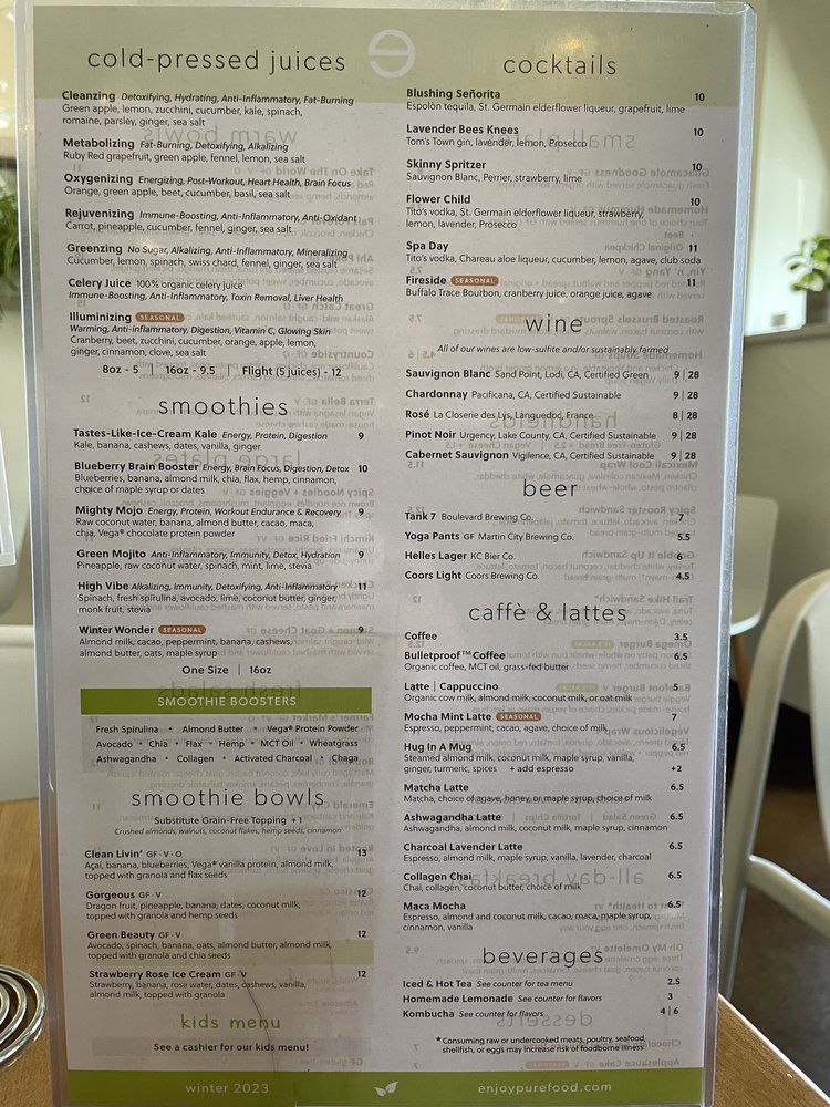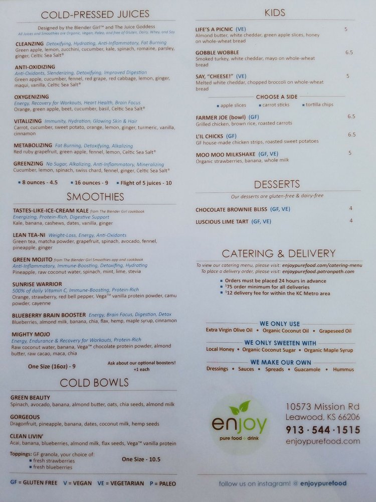 Enjoy pure food drink is a vegetarian, gluten-free restaurant located in Leawood, KS. This trendy and classy establishment offers a diverse menu with options like juice, smoothies, and vegan dishes. Customers rave about the healthy and delicious food, friendly service, and clean, cute decor. The Rooster sandwich, turkey wrap, and Take on the world bowl are must-try items according to reviews. The establishment also takes pride in its environmentally-friendly practices, providing reusable tableware. With convenient amenities like delivery, takeout, and wheelchair accessibility, Enjoy pure food drink is a go-to spot for those looking for nutritious meals in a welcoming environment. The variety of options and quality of food make it worth a visit for a satisfying dining experience.